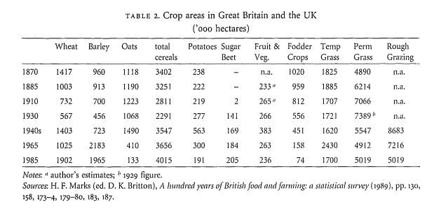 However, the real point here is the rapid decline of arable land in favour of permanent grass between 1870 and 1930, the reversal during World War II, and the sustained gain in arable after the war. The received view, and here I am just going to cut and paste from Wikipedia (with editting and formatting changes), is that: