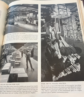 C. J. Whipple, the engineer-trained chairman, was so impressed by pioneering Army use of pallets , s and fork trucks that he decided to bring it to his employer. Drag lines came from American Express, giant buildings from Willow Run. The organisation is based on giving salesmen carefully planned forms, so that they can write the catalogue numbers in. Those numbers show exactly where the product is stored in the warehouse, so that a clerical department of 350 workers can send them by conveyor belt to a visible card file battery, which shows how the items are packed, so that address labels can be prepared. Addressographs hold the addresses of regular customers. Forms are photographed full size by a Bruning Volumatic machine to provide file copies and invoices. Orders ship within six hours of receipt.